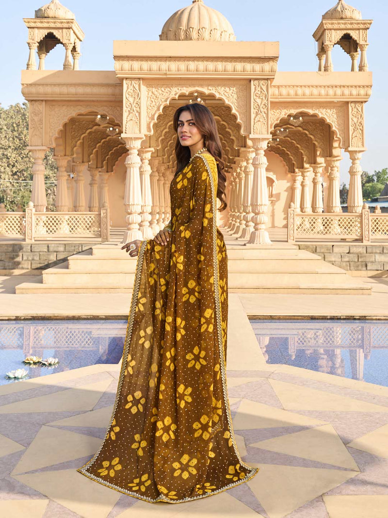 This brown saree crafted in chiffon is designed for comfortable everyday wear while still offering a festive touch for light occasions. Made from lightweight chiffon fabric, this chiffon saree drapes smoothly and feels easy to carry, making it suitable for long hours without discomfort and ideal as a daily wear saree for women.